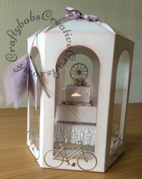 Wedding Day keepsake made to co-ordinate with the Stunning cake, made by the bride herself (checkout Bliss Cupcakes and Celebration cakes on Facebook) and her beautiful dress and also link with the cycling theme of the day. Keepsake made using Scary Mary Celebration Cake kit and various die cutters including Tattered Lace Chatsworth and Haddon die (for lace effect on top cake), Memory box tandem die (bike wheel on top of cake), Quickutz cycle die (on presentation box), small flower punch for tiny roses. Quickutz Scalloped and plain nesting circles (to make ruffles on bottom cake). Card tinted with Tim Holtz Victorian Velvet distress inks (roses and presentation box. Cake stand silver leafed.