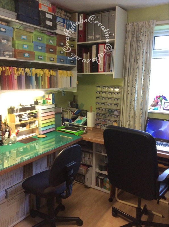 The rainbow drawers hold all my card making essentials, scissores, tweezers, embossing tools, sticky foam pads, double sided tapes, poky tools, flower shaping tools etc. Below the work top on the top 2 shelves of the corner unit is where my 8″x8″, A5, 6″x6″ and other small paper pads and stacks live leaving the bottom section for envelopes. The small unit to the left of the desk area houses my CDroms. The two shelves on the wall house various craft magazines.