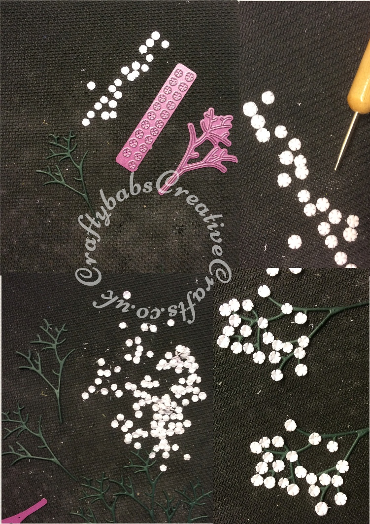 Collage of 4 pictures showing dies used (Cheery Lynn Baby’s breath)and steps of assembly. Flowers embossed with fine ball tool onto the rubber back of an old mouse mat.