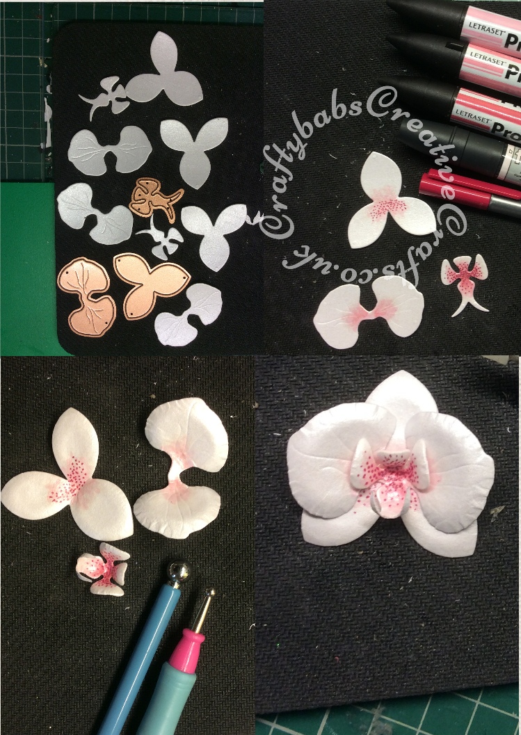 ftwo Published September 28, 2015 at 749 × 1057 in ftwo ← Previous Next → Collage of 4 pictures showing cutting, colouring, shaping and assembly of Orchids using Spellbinders Die D Lites Ochid dies, promarkers, fine liner pen and ball tools in various sizes.