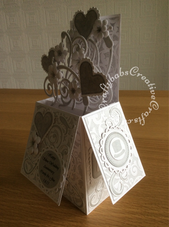 Pop up Silver Wedding Anniversary card made using a number of dies including; Spellbinders nesting plain and scalloped hearts dies, Cheery lynn flowers dies, Anna griffin flourish scroll die, spellbinders lacey circles dies, Crea Nest lies no 33 dies, leabilities frame square curve die set (for small flourishes). Joy cut & emboss wedding die set, Nellies nesting stitched squares dies, Background embossed with distress ink applied to folder using embossaliscious a4 folder. die cuts inked whilst in die in matching distress ink (Hickory Smoke). - craftybabscreativecrafts.co.uk