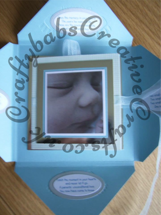 Inside the parcel the book is tied closed with an organza ribbon closure, there are printed sentiment on each inside corners of the outer cover.
