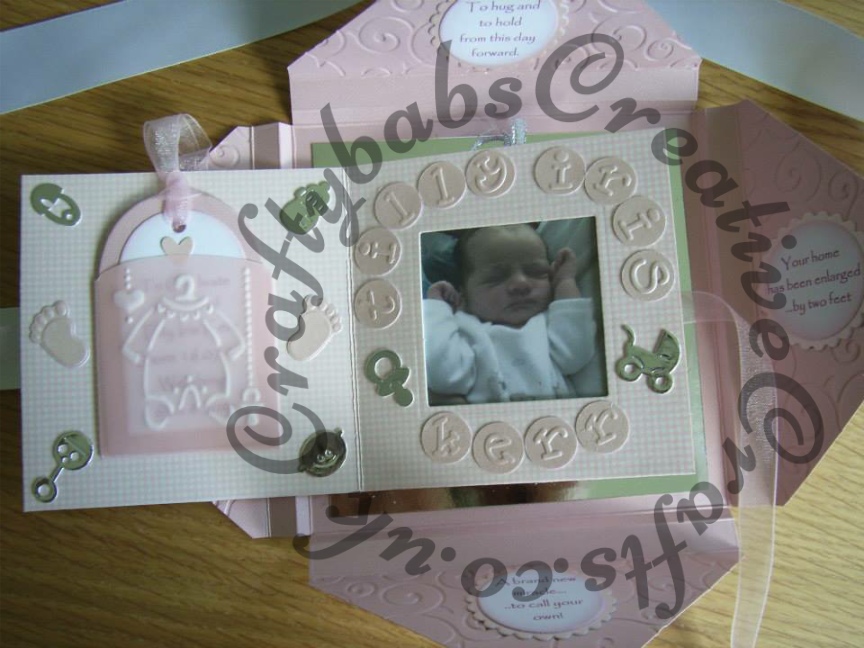 Inside the first page of the book is an embossed parchment pocket holding a tag that has details of date of birth, weight etc. tag is attached to the book with organza ribbon.
