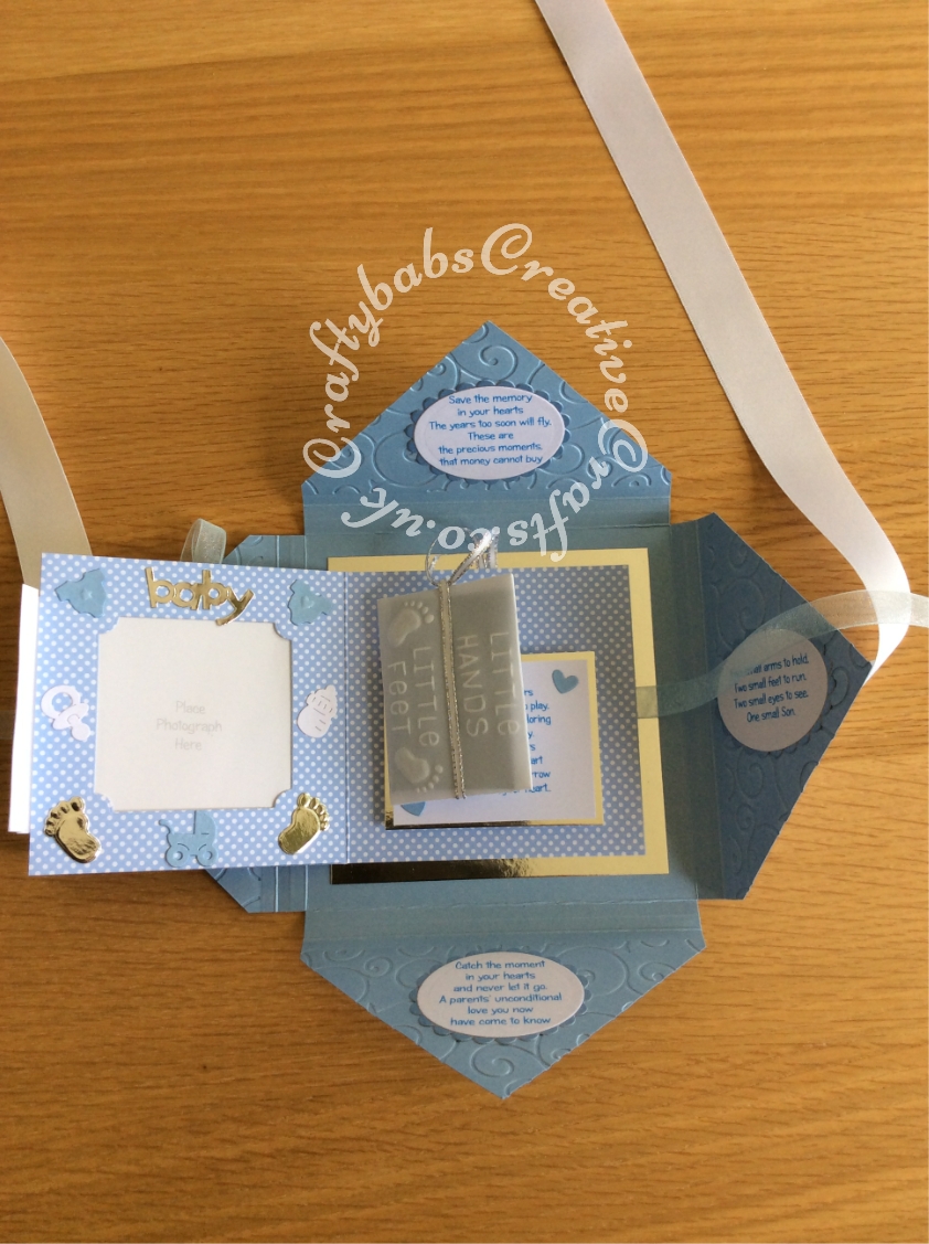 Baby Boy Birth keepsake made using a variety of dies including Marianne Design Cutting and embossing stencils Creatables - My first sneakers, Quickutz nesting Tag dies, Lettering created using Gemini Die Set Expressions Uppercase Alphabet, Gemini Die Set Expressions Lowercase Alphabet, Ellison thick cutz envelope die, Cuttlebug baby elements die, Marianne baby feet dies, Spellbinders nesting plain & scalloped oval dies, Parchment pocket made using an envelope template stencil, baby clothes and baby words embossed using brass stencils, outer cover embossed using couture creations intrinsic embossing folder. - craftybabscreativecrafts.co.uk