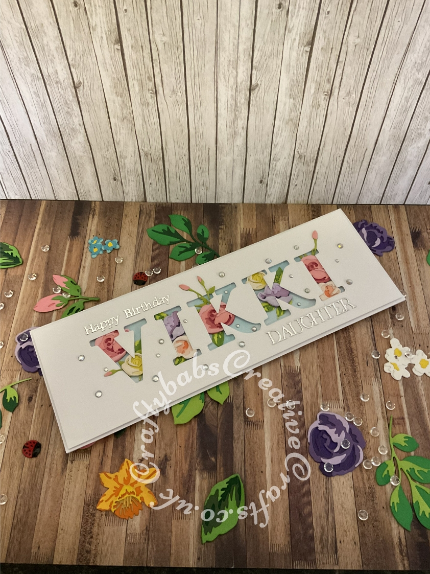 Birthday card made using a number of dies including ‘Happy Birthday’ sentiment from Tattered Lace sentiments 2014 dies, ‘Daughter’ sentiment from 3 Die-mensions handbag die set, and layered flowers dies and Card Making Magic Die Set Solid Alphabet Letter by Christina Griffiths