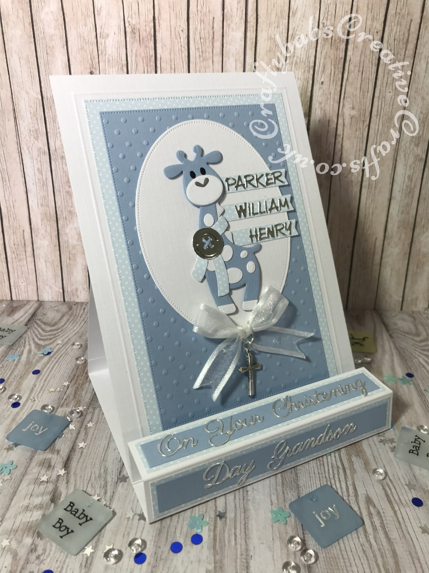 Pop up Easel Block card for Christening day. Fold inspired by Sam Calcott of Mixed up craft. Made using various dies including: unbranded nesting pierced rectangle dies, cuttlebug swiss dots embossing folder. unbranded nesting pierced ovals dies, Marianne Collectable Dies - Eline's Giraffe, Britannia dies sentiments and Die-Versions 'Micro Marker' Alphabet - craftybabscreativecrafts.co.uk