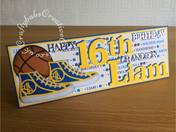 16th Birthday Basketball themed card made using various dies including; sentiment dies from various Tattered Lace 3 Die-mensions die sets, Card Making Magic by Christina Griffiths Upper and lower case alphabet dies and number dies, Cuttlebug® Disney 3x3 Combo Set - Tag Team Sports Balls and Tonic Rococo Kids Canvas Sneaker 1471E die. - craftybabscreativecrafts.co.uk