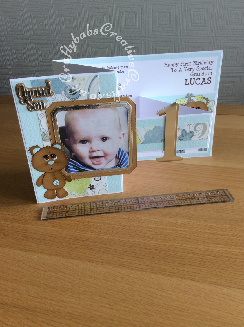Large A4 Landscape Z fold 1st Birthday card made using Surpise Creation nested stitched Octagon square dies, Sizzix Bigz Sassy Serif Numbers dies, unbranded Bear with parcels die set, unbranded bear die and Paper Boutique Die Set Male Relations Sentiments.