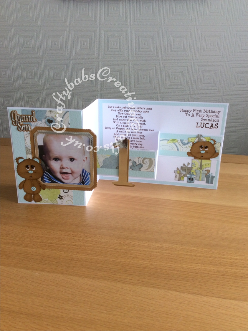 Large A4 Landscape Z fold 1st Birthday card made using Surpise Creation nested stitched Octagon square dies, Sizzix Bigz Sassy Serif Numbers dies, unbranded Bear with parcels die set, unbranded bear die and Paper Boutique Die Set Male Relations Sentiments.