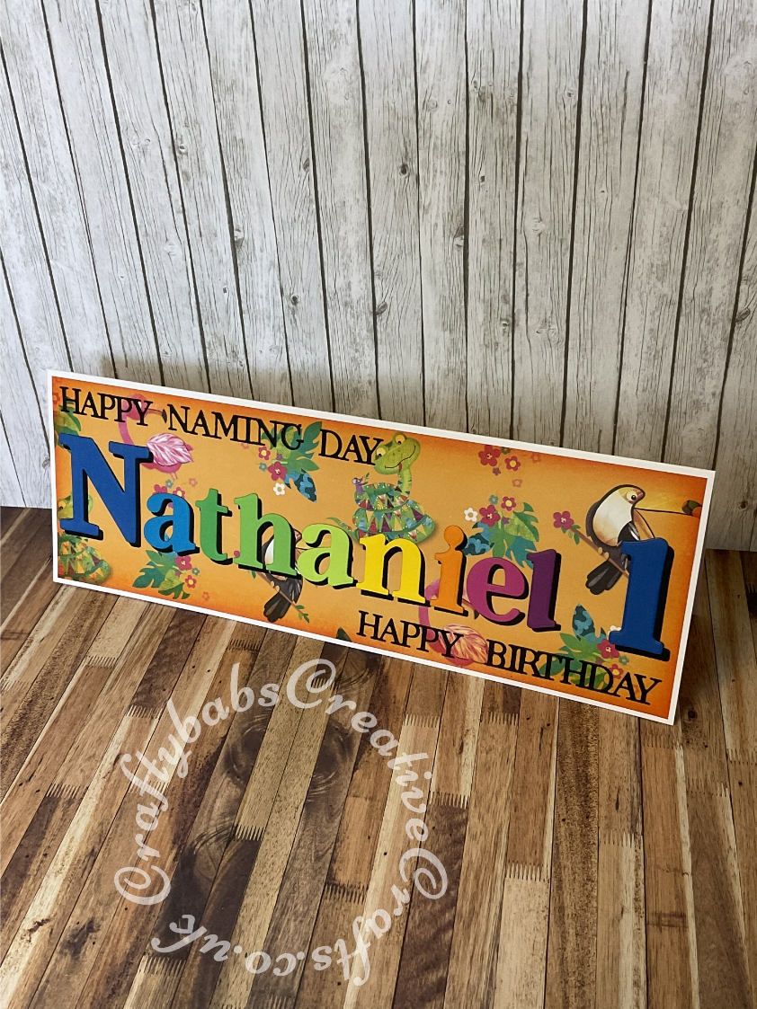 Baby's Naming day and First Birthday card in one. Made using patterned papers and the following dies :- Card Making Magic Upper and Lower Case alphabet dies, Card Making Magic Numbers dies. Tattered Lace sentiment dies snipped into to create the words 'Naming Day'. - craftybabscreativecrafts.co.uk