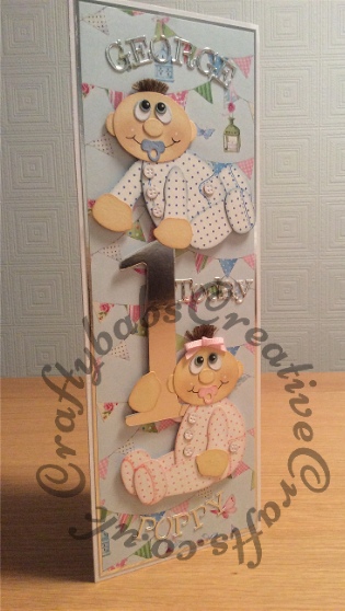t15 Published October 8, 2015 at 315 × 558 in Boys ← Previous Next → 1st Birthday card for twins using a variety of dies including Sizzix Bigz number die, custom made Craftycat wooden ‘New bear’ die and Cuttlebug ‘typeset’ alphabet dies. Hair made using embroidery thread. Dummy made using Go Kreate Baby Burp die.