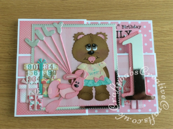Ist birthday Girl Z Fold card made using various unbranded bear, bear outfit and parcel dies, Alphabet balloons dies from The Works and Sizzix Bigz Sassy Serif Numbers dies and Die Monde custom made wooden bear and bunny die. - craftybabscreativecrafts.co.uk