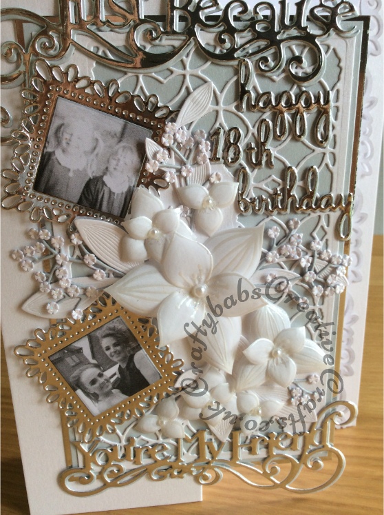 18th Birthday Card using a variety of dies including Tonic ‘just because’ & spellbinders sentiments 3 dies, Cheery Lynn baby’s breath dies, Spellbinders romantic vines dies, Sizzix Tim Holtz mixed media dies (for background), Spellbinders triple floral squares dies. Flowers made using Dreamees Flowers stamps, heat embossed with pearl embossing powder onto thick parchment and hand cut.