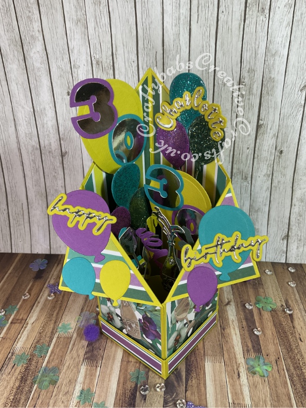 Tuxedo Pop up box 30th birthday card made using various dies including Sizzix Originals Shadow Box numbers dies, wine glass die from free gift in Simply Cards and Paper Craft magazine issue 161, Quickutz cookie cutters nesting balloons die set, Fuzzy Lemon bunch of balloons die, Celebration words script dies, Champagne bottle die from the Tattered Lace Championship die set, streamers die from The Tattered Lace Cocktail time die set and the Gemini Expressions Metal Die – Uppercase and lower case Alphabet Sets.