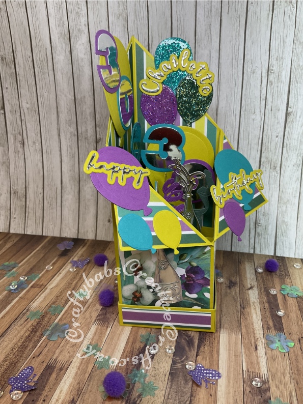 Tuxedo Pop up box 30th birthday card made using various dies including Sizzix Originals Shadow Box numbers dies, wine glass die from free gift in Simply Cards and Paper Craft magazine issue 161, Quickutz cookie cutters nesting balloons die set, Fuzzy Lemon bunch of balloons die, Celebration words script dies, Champagne bottle die from the Tattered Lace Championship die set, streamers die from The Tattered Lace Cocktail time die set and the Gemini Expressions Metal Die – Uppercase and lower case Alphabet Sets. - craftybabscreativecrafts.co.uk
