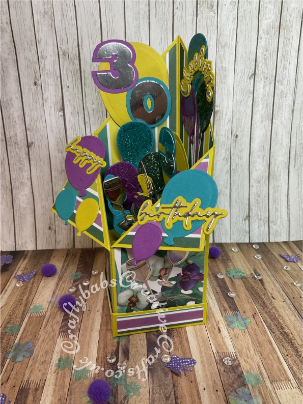 Tuxedo Pop up box 30th birthday card made using various dies including Sizzix Originals Shadow Box numbers dies, wine glass die from free gift in Simply Cards and Paper Craft magazine issue 161, Quickutz cookie cutters nesting balloons die set, Fuzzy Lemon bunch of balloons die, Celebration words script dies, Champagne bottle die from the Tattered Lace Championship die set, streamers die from The Tattered Lace Cocktail time die set and the Gemini Expressions Metal Die – Uppercase and lower case Alphabet Sets. - craftybabscreativecrafts.co.uk