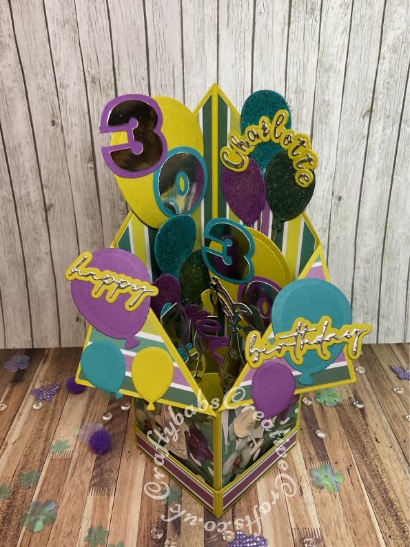 Tuxedo Pop up box 30th birthday card made using various dies including Sizzix Originals Shadow Box numbers dies, wine glass die from free gift in Simply Cards and Paper Craft magazine issue 161, Quickutz cookie cutters nesting balloons die set, Fuzzy Lemon bunch of balloons die, Celebration words script dies, Champagne bottle die from the Tattered Lace Championship die set, streamers die from The Tattered Lace Cocktail time die set and the Gemini Expressions Metal Die – Uppercase and lower case Alphabet Sets. - craftybabscreativecrafts.co.uk