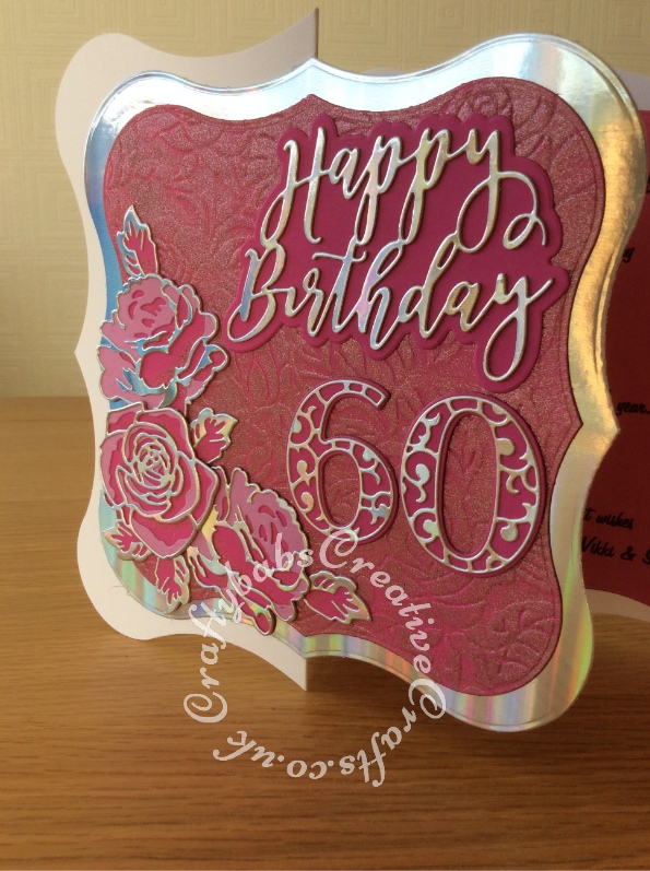 Large 8" x 8" 60th Birthday card made using shaped card blank, Jus-Cutz A4 nesting dies, Card Making Magic Die Set Solid Number & Suffix by Christina Griffiths, Card Making Magic Dies Overlay Number & Suffix Everyday Edition Filigree Pattern Christina Griffiths, Card Making Magic Die Set Happy Birthday Sentiment | 6in x 6in Collection by Christina Griffiths, Card making Magic Die Set Christmas Rose by Christina Griffiths, Alt-e-new Layered Rose die set, free with issue 174 of Simply Cards & Papercraft magazine, Tattered Lace embossing folder Floral (EF042), embellished with Cosmic Shimmer Pink Sapphire Glitter Kiss. - craftybabscreativecrafts.co.uk