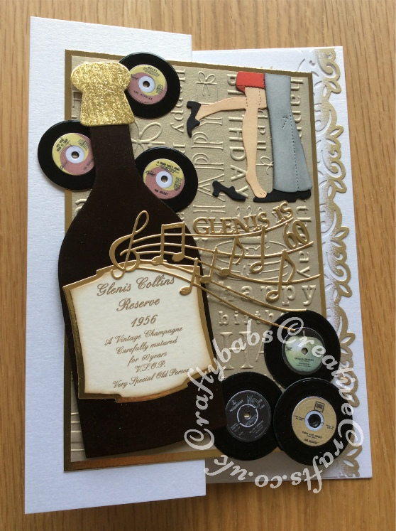 Card made using a number of different dies including, custom made wooden champagne and dancing legs dies, nesting circles dies for records, Tattered lace sentiment dies paper pieced, memory box party music die. Background embossed with xcut happy birthday embossing folder. Champagne bottle label printed and cut with spellbinders labels two dies.