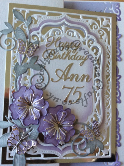 75th Birthday card made using Spellbinders Elegant labels 4 (inked through with distress inks), Blooms 3 and Romantic vines, Britannia sentiment dies, Cheery Lynn Lace script numbers dies and Memory box butterfly dies. Insert edge punched with Woodware crafty edger punch.