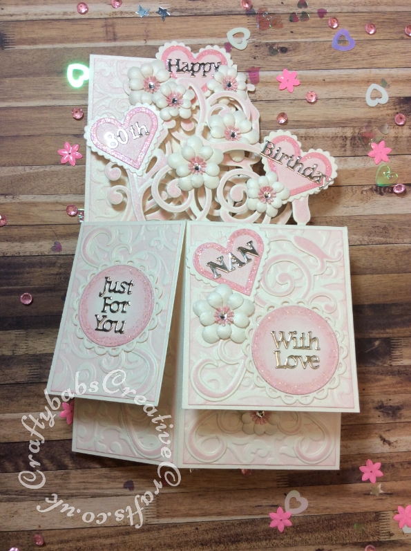 Pop up 80th Birthday card made using a number of dies including; Spellbinders nesting plain and scalloped hearts dies, Cheery lynn flowers dies, Anna griffin flourish scroll die, spellbinders lacey circles dies, Crea Nestlies no 33 dies, leabilities frame square curve die set (for small flourishes). Nellies nesting stitched squares dies, Background embossed with Spun Sugar distress ink applied to folder using embossaliscious a4 folder.