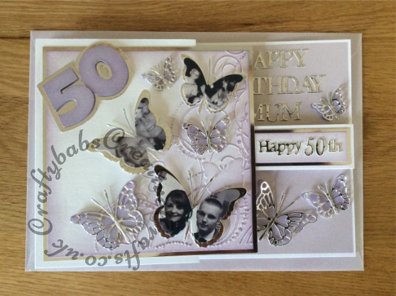 Double Z fold 50th birthday card using various dies including; Memory box Leavenworth and cascadia butterflies, Tatteref Lace sentiment dies, Sizzix originals Shadow box number dies and Darice butterflies embossing folder - craftybabscreativecrafts.co.uk
