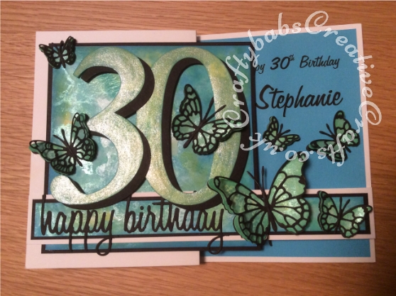 Double Z Fold 30th Birthday Card made using a variety of dies including; Memory Box Leavenworth & Cascadia Trio butterfly dies, Memory Box Darla & Vivienne Butterfly dies, 660223 Sizzix Thinlits Die Set 13PK - Celebration Words Script by Tim Holtz and 656617 Sizzix Bigz Sassy Serif Numbers. Background made using Distress oxide inks, Spectrum Noir sparkle pen and mica spray inks - craftybabscreativecrafts.co.uk