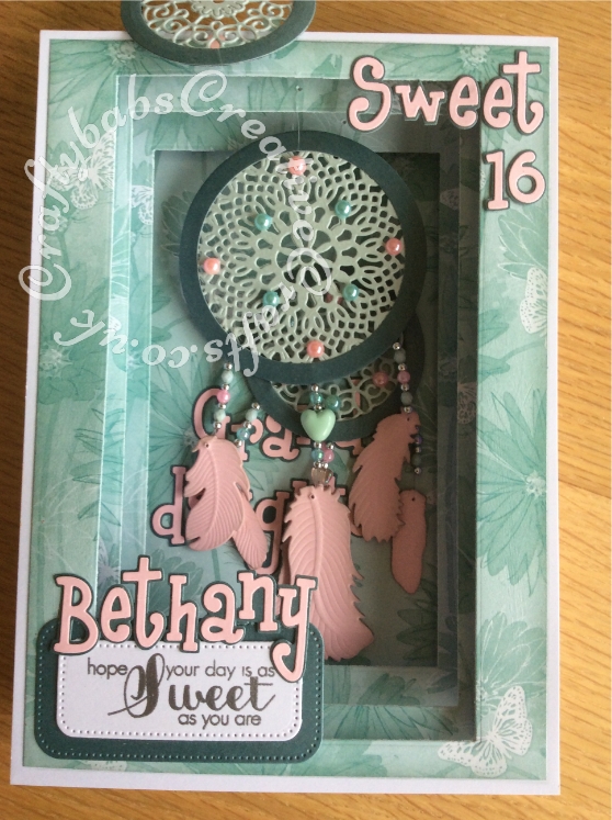 Dream Catcher Panorama Card made using a variety of dies including; Todo collection feather dies, Spellbinders Shapeabilities Dies-Feathers, Sizzix Sizzlits Alphabet 654546 Girls are weird dies, Nesting Circles dies, Nellie Snellen Multi Frame Dies - Straight Dotted Rectangle dies, Tattered Lace Doily Flourish die, Hardwick Scallop Circle (D358) die, Tattered Lace Panorama Large Inner Plates (PAN02) and Tattered Lace Panorama Large Concertina Side (PAN03) - craftybabscreativecrafts.co.uk