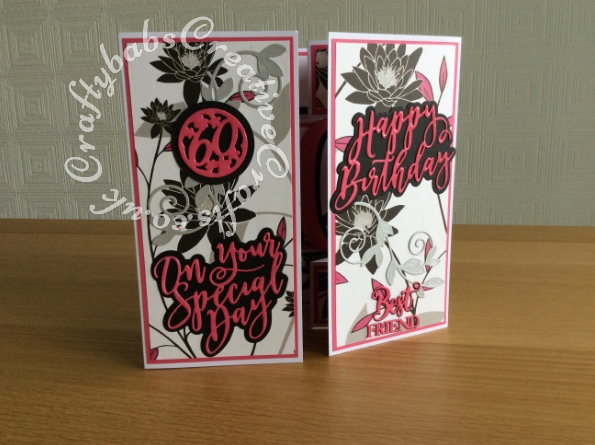 Extra Large Double Shutter 60th Birthday card made using 3 8″x8″ card blanks joined together and various dies including; Card Making Magic Die Set Happy Birthday Sentiment | 6in x 6in Collection by Christina Griffiths, Card Making Magic Die Set On Your Special Day Sentiment 6in x 6in Collection by Christina Griffiths, Sizzix Bigz Sassy Serif Numbers dies, Tattered Lace Die-Special Person, Nellie Snellen Multi Frame Dies – Straight Dotted Rectangles, Creative Expressions In the Tool Box Necessities Craft Die Set CED23011 for ‘Best Friend’ sentiment, Tonic Studios “Occasions” Pop up sentiment dies and various sentiment stamps for sentiments.