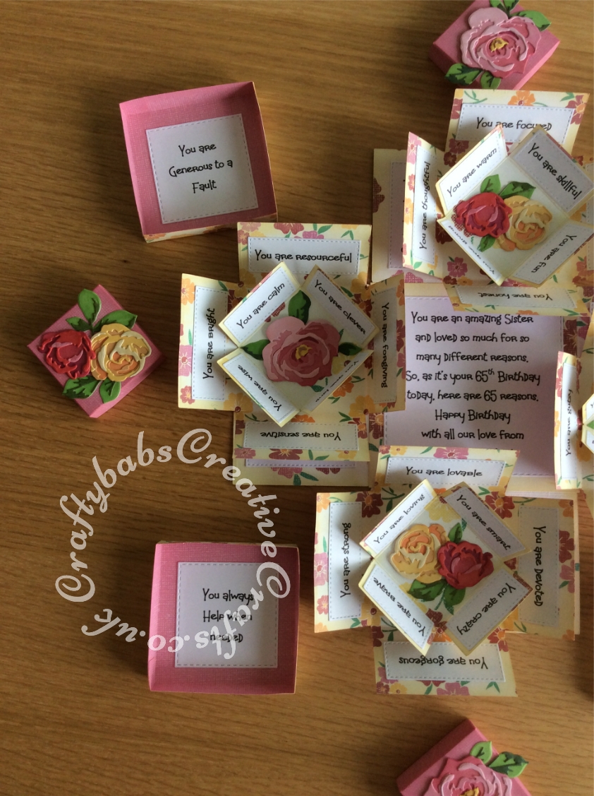Multiple Exploding Box card made from double sided papers using various dies including; SIMPLY MADE CRAFTS DIE SET MEDIUM EXPLODING GIFT BOX die set. Card Making Magic Die Sets Solid & Overlay Number & Suffix, Altenew 3D Die Set Garden Picks and Crealies Nest-Lies XXL Die Set No 34 Double Stitch Squares. - craftybabscreativecrafts.co.uk