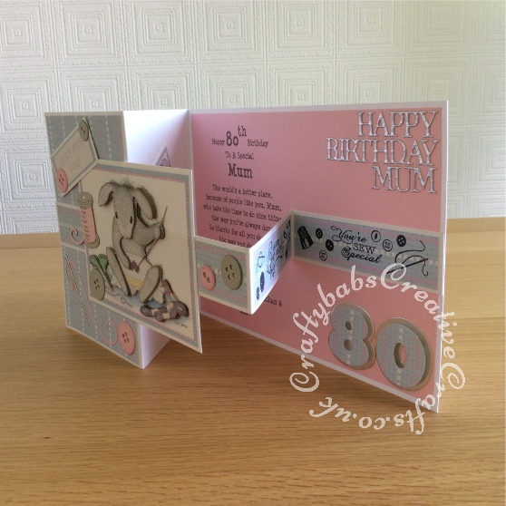 Mum 80th double ‘Z’ Birthday card made using Joanna Sheen Gruffles & Happy hoppers CDrom and various dies including Xcut A5 Haberdashery die set, Sizzix originals Shagow box numbers, Tattered Lace sentiment dies (from 3Diemensions sets). Stamps (free in a card craft magazine but can’t remember which on one)