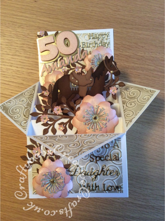 Large Pop up Box Horse themed 50th Birthay card made using various dies including; Quickutz Wildflower die set for large flowers with Cheery Lynn Designs - DIE - Build-a-Flower Embellishments # 3 die for flower stamens, Sue Wilson Finishing Touches Dies - Spring Foilage for branches and small flowers, Quickutz exclusive Remi the Horse revolution die for the horse and saddle, Sizzix Sizzlits Alphabet Script dies for name, Sizzix originals Shadow box numbers dies, Tattered Lace Sentiments 2014 (D211) dies and Britannia dies Daughter sentiment die. Sizzix Sizzlits, Dies Wester Set 38-9847 for horse shoes and Couture Creations Intrinsic Embossing Folder - craftybabscreativecrafts.co.uk