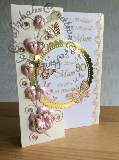 80th birthday card made using Tattered lace Hardwick scallop circle die, Spellbinders plain circle die, Memory Box Vivienne, Delia, Pippi & Isabella butterflies and Gwyneth flourish dies, Spellbinders butterflies from Flutter tree set, Cuttlebug baby face alphabet & number dies for numbers and Tattered lace lavish blooms poppy and lacy rose dies. Sentiment printed.