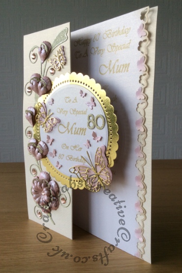80th birthday card made using Tattered lace Hardwick scallop circle die, Spellbinders plain circle die, Memory Box Vivienne, Delia, Pippi & Isabella butterflies and Gwyneth flourish dies, Spellbinders butterflies from Flutter tree set, Cuttlebug baby face alphabet & number dies for numbers and Tattered lace lavish blooms poppy and lacy rose dies. Sentiment printed.