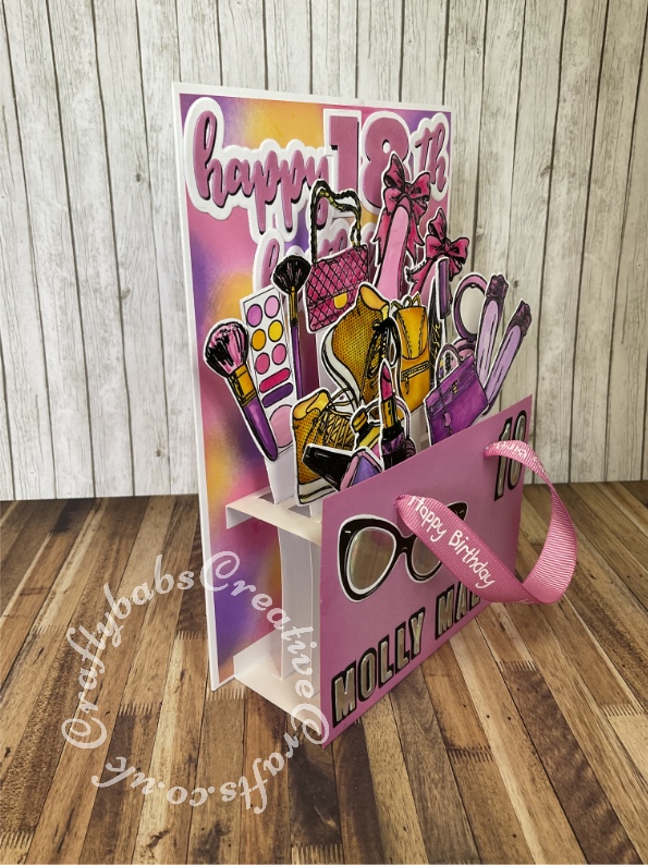 Girlie themed Pop up birthday card Inspired by Sam Calcott. Mechanism made using a paper trimmer and score board rather than dies, Made to surprise super sliders collection shoes and handbags and make up die and stamp sets, Bright Rosa Happy birthday sentiment dies, Sizzix Originals Shadow box number dies, Crealies number dies and unbranded shadow alphabet dies.