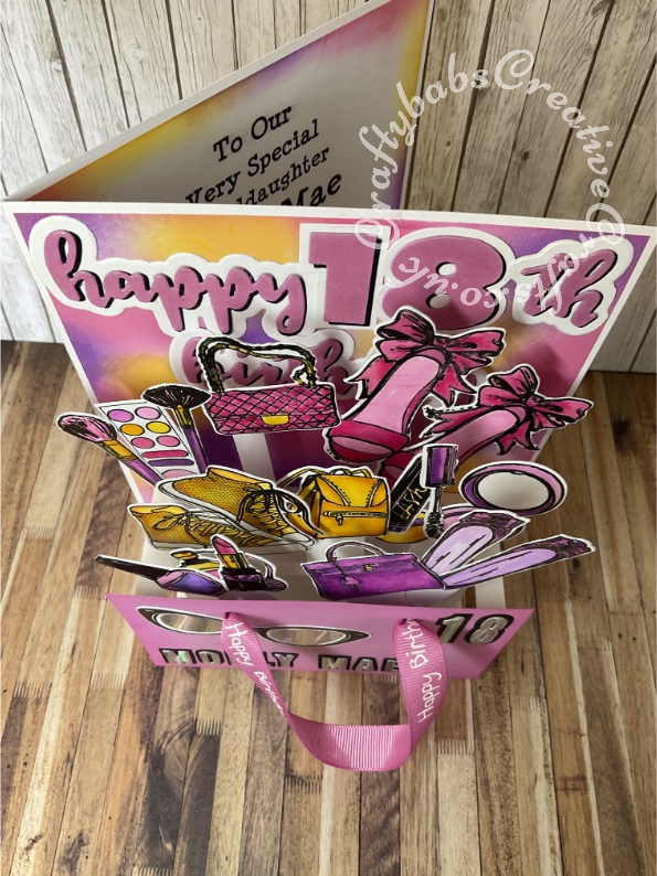 Girlie themed Pop up birthday card Inspired by Sam Calcott. Mechanism made using a paper trimmer and score board rather than dies, Made to surprise super sliders collection shoes and handbags and make up die and stamp sets, Bright Rosa Happy birthday sentiment dies, Sizzix Originals Shadow box number dies, Crealies number dies and unbranded shadow alphabet dies. - craftybabscreativecrafts.co.uk