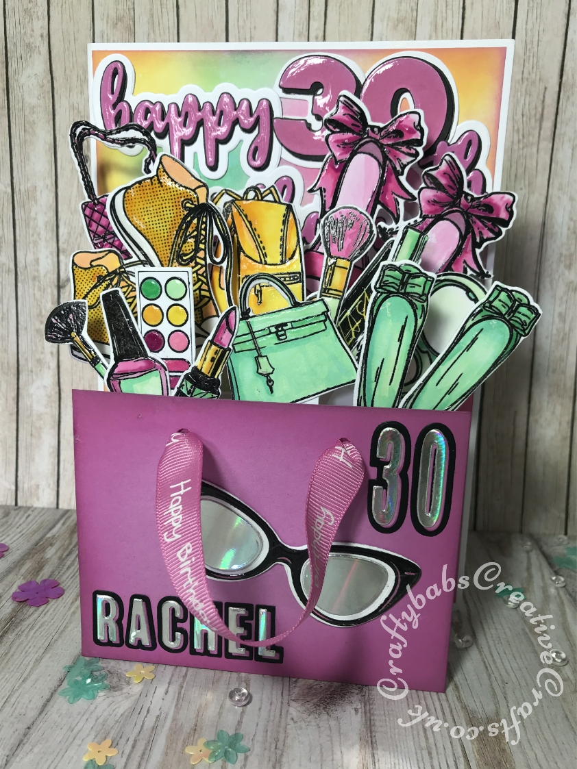 Girlie themed Pop up birthday card Inspired by Sam Calcott. Mechanism made using a paper trimmer and score board rather than dies, Made to surprise super sliders collection shoes and handbags and make up die and stamp sets, Bright Rosa Happy birthday sentiment dies, Sizzix Originals Shadow box number dies, Crealies number dies and unbranded shadow alphabet dies.