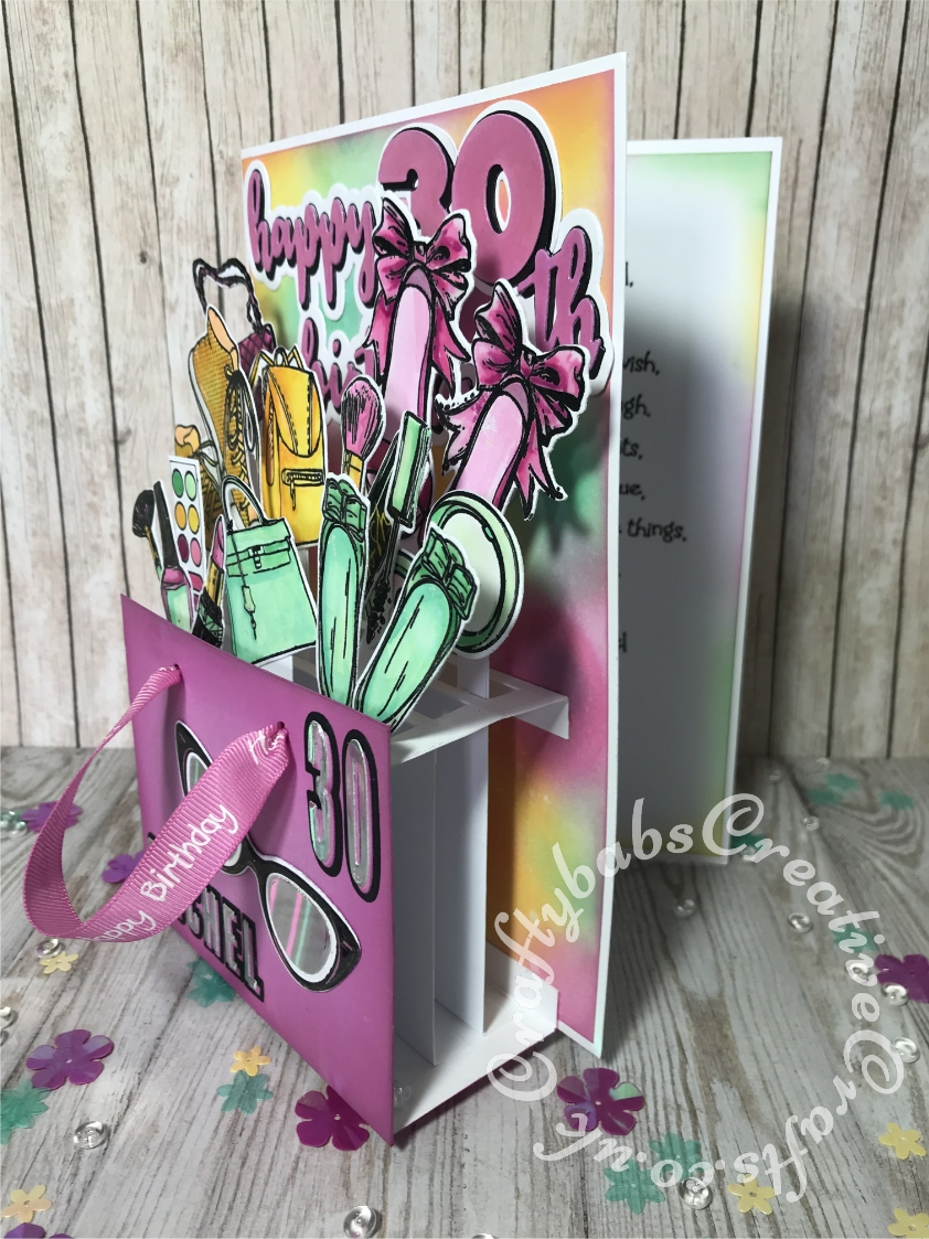 Girlie themed Pop up 30th birthday card Inspired by Sam Calcott. Mechanism made using a paper trimmer and score board rather than dies, Made to surprise super sliders collection shoes and handbags and make up die and stamp sets, Bright Rosa Happy birthday sentiment dies, Sizzix Originals Shadow box number dies, Crealies number dies and unbranded shadow alphabet dies. - craftybabscreativecrafts.co.uk
