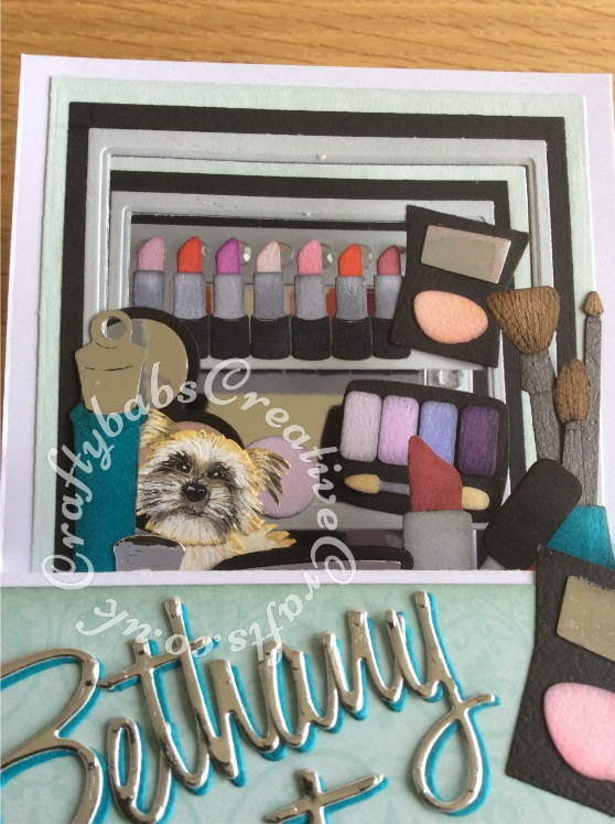 Large Pop Up Make up themed 16th Bithday Card made using a variety of dies including; Sizzix Thinlits Die Set – 662228 Script Alphanumeric Alphabet by Tim Holtz, Sizzix Thinlits Celebration Words: Script set 660223, Quickutz Cookie cutters SGS-09-FLIRT set. Quickutz 2X2″ metal dies – Make Up – KS-0405, Sizzix Sizzlits Die Set – Glam Girl Set-655314, Ellison thin cut eye make up die,Nesting rectangle dies, Sizzix Originals Shadow Box number dies, Quickutz Dog die [KS-0539]. and Sizzix-Bottles glass and Corks-Die-38-1059