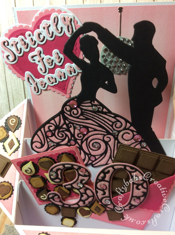 Large Pop Up Box Strictly come dancing and chocolate themed 30th Birthday card made using various dies including: Card Making Magic Die Sets Solid & Overlay Number & Suffix die sets, Crafters companion Gemini Expressions Metal Die - Uppercase and lower case Alphabet die sets, various small nesting square and shape dies for chocolates, Nellie Snellen multi frame nest plain and scalloped heart dies, Memory Box party music die, Sizzix Thinlits happy birthday from the everyday sentiment die set and Intricut Couple Silhouette Die. - craftybabscreativecrafts.co.uk