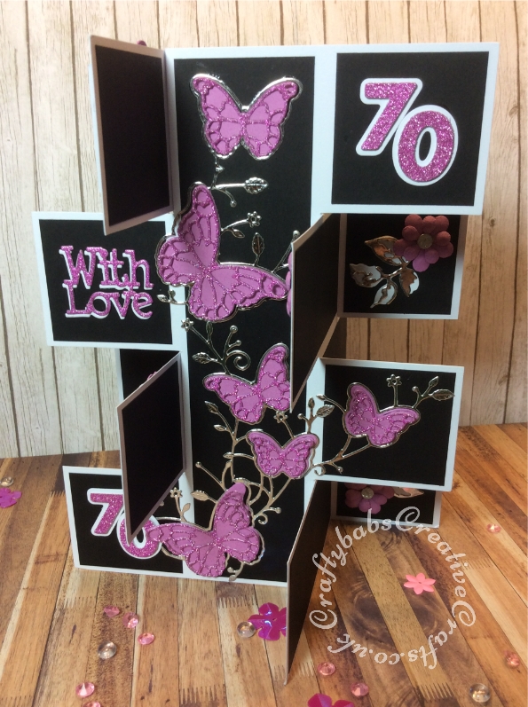 8" x 8" Tower block card inspired by Sam Calcott of Mixed Up Craft using various dies including Sizzix Sizzlits alphabet Fruit Smoothie, Memory box Fluttering Corner die, Altenew Garden Picks dies, Gemini Expressions Metal Die – Uppercase and lower case Alphabet Sets. Tattered Lace With Love sentiment die, Cheery Lynn flower dies and iCraft Happy and Birthday sentiment dies. - craftybabscreativecrafts.co.uk