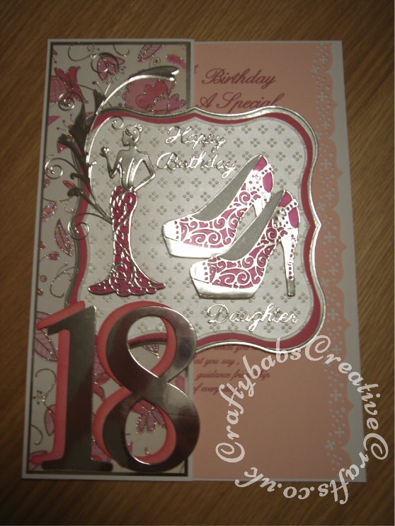 A4 Fashion/shoe themed 18th Birthday Card made using various dies including;Memory Box Gwyneth Flourish die, Tattered Lace Olivia die, Cheery Lynn High Heeled Steam Punk Shoe dies, Sizzix Bigz Sassy Serif Numbers dies, Britannia dies Happy Birthday sentiment, Jus Cutz nesting labels dies and Tattered Lace Ditsy Dots embossing folder. Woodware crafty edger tag border punch used for insert. - craftybabscreativecrafts.co.uk