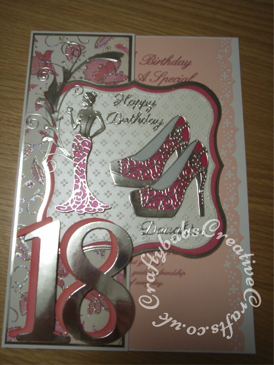 A4 Fashion/shoe themed 18th Birthday Card made using various dies including;Memory Box Gwyneth Flourish die, Tattered Lace Olivia die, Cheery Lynn High Heeled Steam Punk Shoe dies, Sizzix Bigz Sassy Serif Numbers dies, Britannia dies Happy Birthday sentiment, Jus Cutz nesting labels dies and Tattered Lace Ditsy Dots embossing folder. Woodware crafty edger tag border punch used for insert. - craftybabscreativecrafts.co.uk