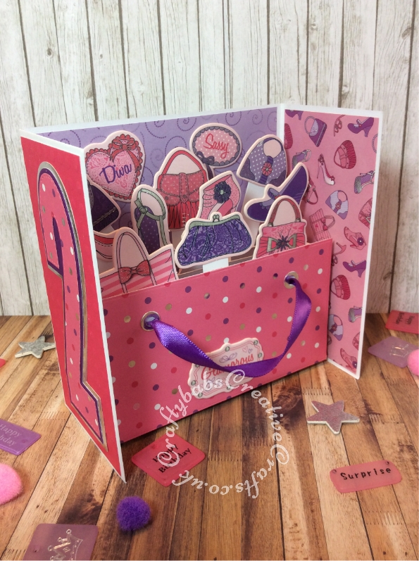 Pop up 21st birthday card inspired by Sam Calcott of Mixed Up Crafts. I didn't have the Made to Surprise dies to make this but managed to make my own mechanism using a scoreboard and craft knife. I used a old pack of chip board embellishments that has been in my stash for years, they came with coordinating papers too. I die cut the numbers using unbranded layered numbers dies. - craftybabscreativecrafts.co.uk