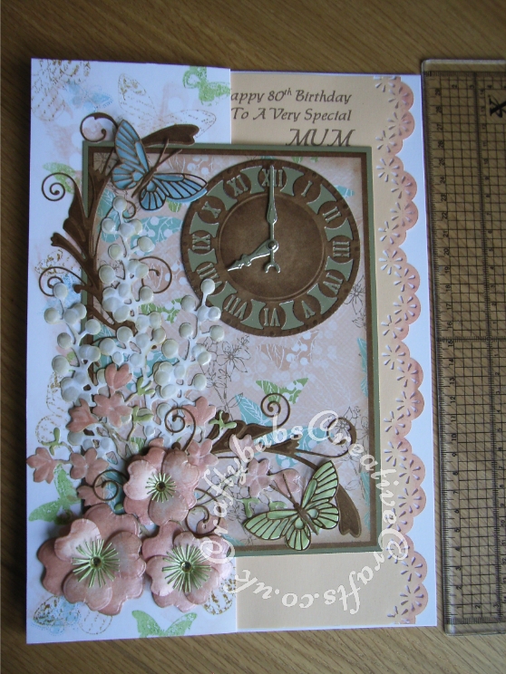 A4 Floral time themed 80th Birthday card made using a variety of dies including; Memory Box Gwyneth flourish die, Memory Box Kaleidoscope and Moonlight butterfly dies, Marianne Craftables Clock CR1234 dies, Cheery lynn Build a flower #1 set for stamens and Quickutz Wildflower die set for large flowers and floral sprays.