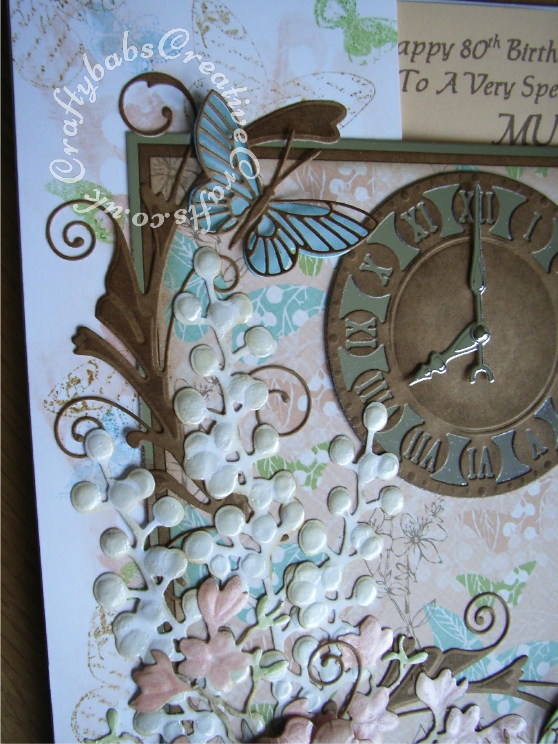 A4 Floral time themed 80th Birthday card made using a variety of dies including; Memory Box Gwyneth flourish die, Memory Box Kaleidoscope and Moonlight butterfly dies, Marianne Craftables Clock CR1234 dies, Cheery lynn Build a flower #1 set for stamens and Quickutz Wildflower die set for large flowers and floral sprays. - craftybabscreativecrafts.co.uk
