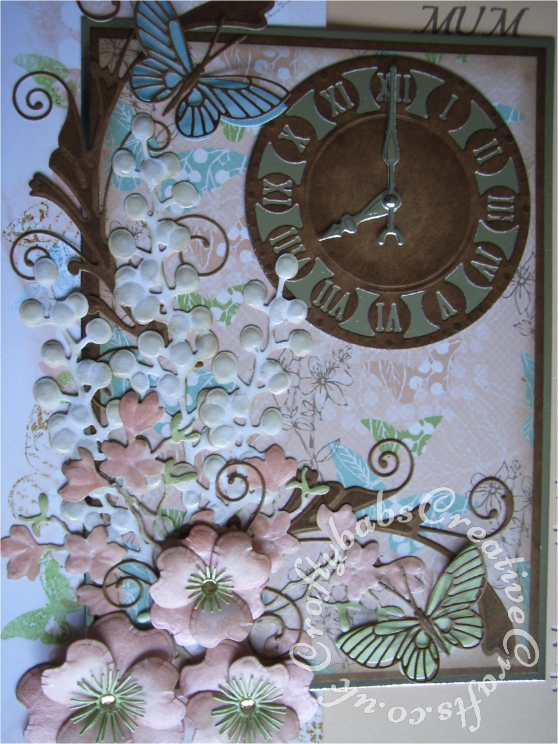 A4 Floral time themed 80th Birthday card made using a variety of dies including; Memory Box Gwyneth flourish die, Memory Box Kaleidoscope and Moonlight butterfly dies, Marianne Craftables Clock CR1234 dies, Cheery lynn Build a flower #1 set for stamens and Quickutz Wildflower die set for large flowers and floral sprays. - craftybabscreativecrafts.co.uk