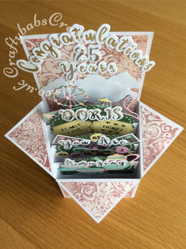Pop up Box Congratulations card made using various dies including; Nellie's Multi Frames Dies Doily Flower MFD020, Crafters Companion Gemini Expressions Metal Die - Uppercase and lower case Alphabet and number Sets, scenic dies free gift from issue 39 of Die Cutting Essentials magazine, SIZZIX SIZZLITS TEATIME Set 654787, HELZ CUPPLEDITCH DIE - FUN FAIR - TICKET dies, cloud dies from various Xcut build a scene All Aboard die set. Mats and layers on base card embossed with Embossalicious A4 embossing folder, then pearl fininsh addes using Cosmic Shimmer gilding polish accented with Cosmic Shimmer Glitter Kiss. Bingo cards and numbers stamped and embossed using La Pashe flippin bingo stamp set. - craftybabscreativecrafts.co.uk