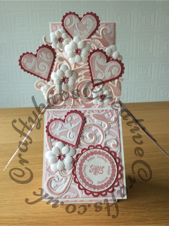 Pop up birthday cardmade using a number of dies including; Spellbinders nesting plain and scalloped hearts dies, Cheery lynn flowers dies, Anna griffin flourish scroll die, spellbinders lacey circles dies, Crea Nest lies no 33 dies, leabilities frame square curve die set (for small flourishes). Background embossed with distress ink applied to folder using embossaliscious a4 folder.