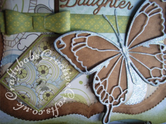 Large Butterfly Easel birthday card made using various dies including; Memory box Tristan, Chloe, Pippi and Isabella dies, My Favourite things Dainty bows dies, Britannia dies Happy Birthday Daughter sentiments dies, Cheery Lynn reflections boutique pearl french flair dies and flourishes from the Marianne scalloped circle frame die set. - craftybabscreativecrafts.co.uk